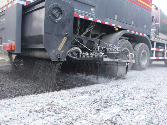 所謂同步碎石封層,就是用專用設(shè)備即同步碎石封層車將碎石及粘結(jié)材料(改性瀝青或改性乳化瀝青)同步鋪灑在路面上。同步碎石封層最大的優(yōu)點就是縮短了粘接劑噴灑與集料擻布之間的時間間隔,增加了集料顆粒與粘結(jié)劑的覆蓋面積,更易保證他們之間穩(wěn)定的比例關(guān)系,能使瀝青和石料的粘結(jié)牢靠,起到“落地生根”的效果,特別是在氣溫較低時施工效果比分體式碎石封層(即瀝青灑布+石料撒布)更為明顯。其次同步碎石封層提高了作業(yè)效率,減少了設(shè)備配套,降低了施工成本。瀝青路面經(jīng)過同步碎石封層處理后,使路面具有良好的抗滑性能和防滲水性能,能有效治愈路面貧油、掉粒、輕微網(wǎng)裂、車轍、沉陷等病害,主要用于道路的預(yù)防性養(yǎng)護和修復(fù)性養(yǎng)護,無論是高速公路還是普通公路都可以使用此項養(yǎng)護新技術(shù)。