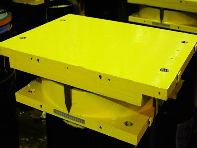 盆式支座的工作原理是利用半封閉鋼制盆腔內(nèi)的彈性橡膠塊,在三向受力狀態(tài)下具有流體的性質(zhì),來實現(xiàn)上部結(jié)構(gòu)的轉(zhuǎn)動;同時依靠中間鋼板上的聚四氟乙烯板與上座板上的不銹鋼板之間的低摩擦系數(shù)來實現(xiàn)上部結(jié)構(gòu)的水平位移。從實驗的數(shù)據(jù)來看,橡膠處于三向約束狀態(tài)時的抗壓彈性模量為5×104kg/cm2,比無側(cè)向約束的抗壓彈性模量增大近20倍,因而支座承載能力大大提高,解決了普通橡膠支座承載能力的局限。所以盆式支座是能滿足大的支承反力,大的水平位移,大的轉(zhuǎn)角要求的新型產(chǎn)品。