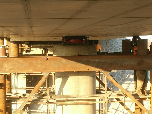 橋梁頂升即是在原橋臺(tái)附近開(kāi)挖基坑澆筑臨時(shí)砼作為頂升支架的基礎(chǔ),頂升支架采用無(wú)縫鋼管,無(wú)縫鋼管加工高度根據(jù)現(xiàn)場(chǎng)情況實(shí)測(cè)高度進(jìn)行加工,保證同軸無(wú)縫鋼管上部放置工字梁面處于同一高度,鋼管上放置頂升用千斤頂,千斤頂上放置工字梁作為分配梁與梁底之間用組合鋼楔緊密接觸。并在橋臺(tái)或墩柱外側(cè)安裝防位移裝置(高度根據(jù)現(xiàn)場(chǎng)實(shí)際情況而定)。頂?shù)轿缓舐淞簤|好臨時(shí)支撐柱。在原橋臺(tái)、墩上進(jìn)行支座墊石放樣,鑿除埋設(shè)支座墊石基槽并打磨平整,調(diào)制環(huán)氧砂漿安放支座墊石,對(duì)支座墊石進(jìn)行焊接,然后安放橡膠支座并找平、落梁。