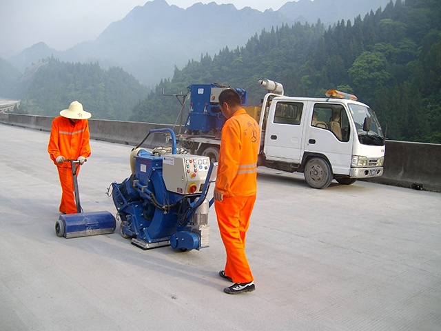 橋梁混凝土鋪裝層處理采用拋丸工藝,即利用拋丸機,拋除混凝土表面的浮漿。使用拋丸處理的表面粗糙均勻;不會破壞原混凝土結(jié)構(gòu)和平整度,并且可以完全去除浮漿和起砂,100%“創(chuàng)面”、露骨;但同時不會造成骨料的松動和微裂紋,為增強混凝土與瀝青面層提供更好的粘結(jié)。
