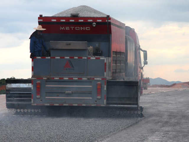 所謂同步碎石封層,就是用專用設(shè)備即同步碎石封層車將碎石及粘結(jié)材料(改性瀝青或改性乳化瀝青)同步鋪灑在路面上。同步碎石封層最大的優(yōu)點就是縮短了粘接劑噴灑與集料擻布之間的時間間隔,增加了集料顆粒與粘結(jié)劑的覆蓋面積,更易保證他們之間穩(wěn)定的比例關(guān)系,能使瀝青和石料的粘結(jié)牢靠,起到“落地生根”的效果,特別是在氣溫較低時施工效果比分體式碎石封層(即瀝青灑布+石料撒布)更為明顯。其次同步碎石封層提高了作業(yè)效率,減少了設(shè)備配套,降低了施工成本。瀝青路面經(jīng)過同步碎石封層處理后,使路面具有良好的抗滑性能和防滲水性能,能有效治愈路面貧油、掉粒、輕微網(wǎng)裂、車轍、沉陷等病害,主要用于道路的預(yù)防性養(yǎng)護和修復(fù)性養(yǎng)護,無論是高速公路還是普通公路都可以使用此項養(yǎng)護新技術(shù)。